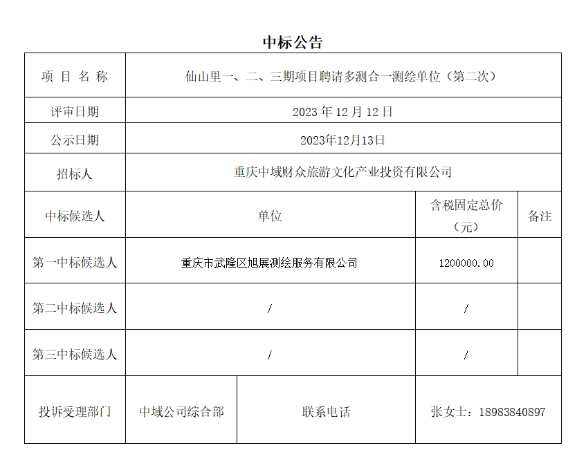 仙山里一、二、三期项目聘请多测合一测绘单位(第二次)中标公告
