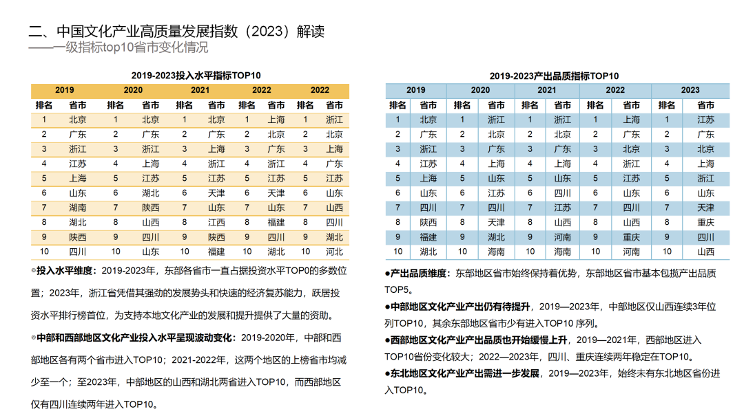 2019-2023年,中国文化产业高质量发展全国排名TOP10榜单整体保持稳定:北京、浙江、江苏、广东、上海等东部地区省市始终稳居中国文化产业高质量发展全国排名TOP10;2023年,中部地区的山西、西部地区的四川依旧位列TOP10。
