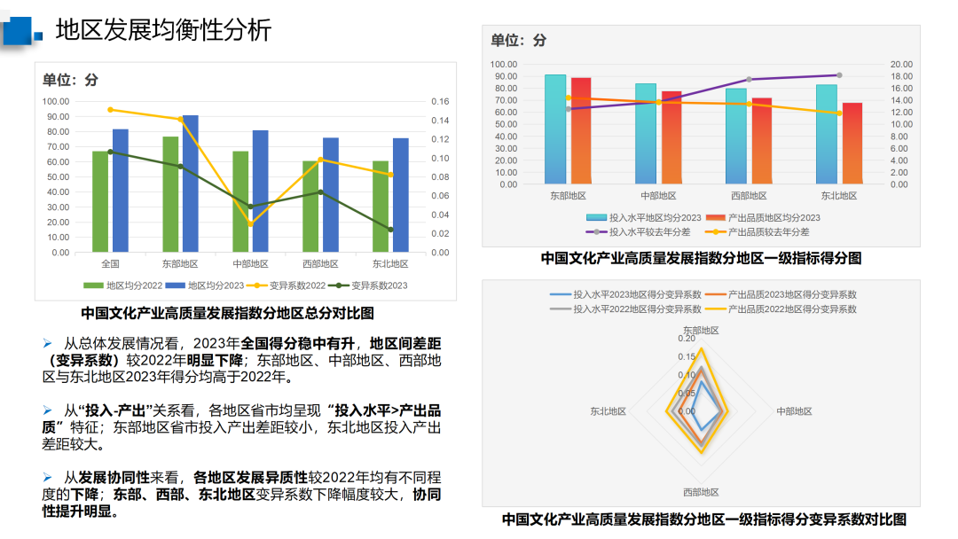 从总体发展情况看,2023年全国得分稳中有升,地区间差距(变异系数)较2022年明显下降;东部地区、中部地区、西部地区与东北地区2023年得分均高于2022年。